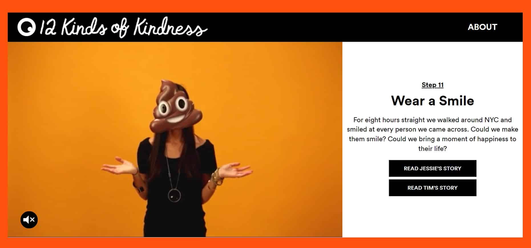 1 מכל 4 אנשים בארצות הברית סובל מבעיות נפשיות. אבל לא מספיק מדברים על זה ועוזרים לזה . אז גסיקה וולש ,האישה והאגדה וטימותי גודמן מעצב ומאייר בעל סטודיו שני תושבי ניו יורק אגוצנטריים, שלעתים קרובות מתמקדים במה שלפניהם במקום במה שסביבם, יצרו סדרה של 12 צעדים כדרך להפוך לאנשים אדיבים ואמפתיים יותר. כהחלטה, הם תרגלו זאת במשך 12 חודשים.ואחרי זה יצאו עם זה במהלך מיתוג מטריף שזכה לפרסים רבים.